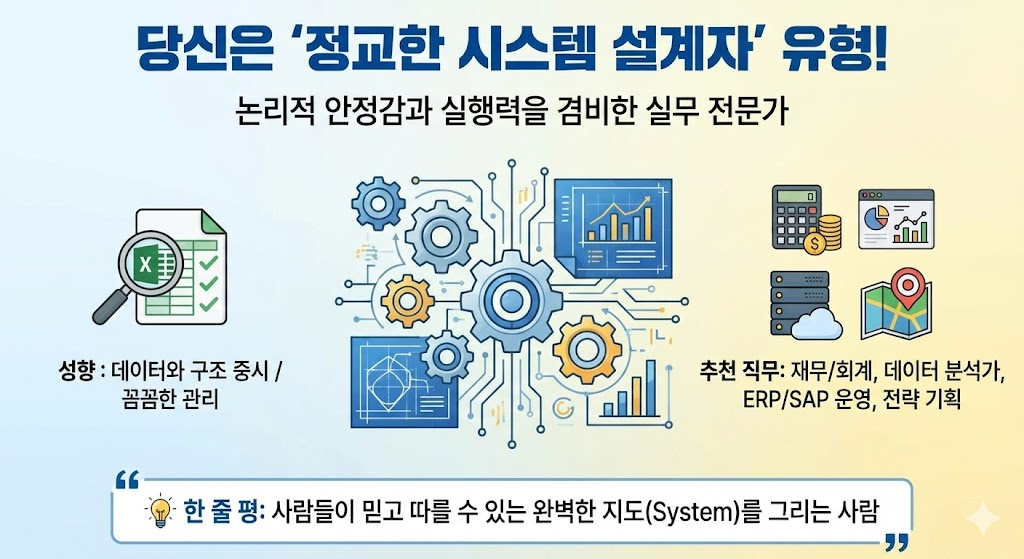 - 성향 요약 : 화려한 겉모습보다는 내실 있는 '데이터'와 '구조'를 중시합니다. 하지만 문제가 생겼을 땐 책상에만 머물지 않고 현장감을 발휘해 해결하는 유연함도 갖추고 계시네요.